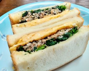 5、パンと具がなじんだら、半分に切って出来上がり。