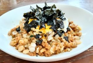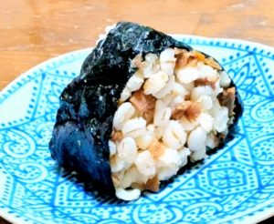 2、ゆで胚芽押し麦に1の漬けぶりあらを混ぜてにぎり、焼のりを巻いて出来上がり。