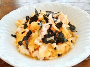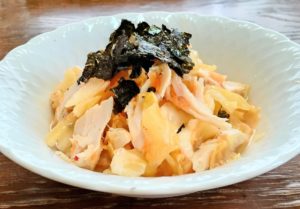 2。器に1のキャベツと鶏ハムを盛り、手で揉んだ焼のりをかけて出来上がり。海苔を混ぜながらいただく。