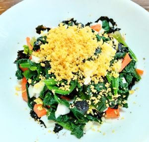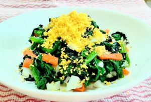 《材料》1ほうれん草70g-2人参(線切り)50g-3卵ゆで1/2個-4焼のり全形1/2枚-5マヨネーズ小さじ2杯-6酢小さじ2杯-7オリーブ油少々