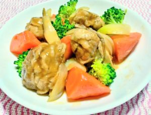 《材料》1豚小間切れ肉80g-2人参(乱切り)60g-3玉ねぎ(乱切り)50g-4ブロッコリー30g-5ゆで姫たけ30g-6片栗粉適量-7醤油大さじ1杯-8ケチャップ大さじ1杯