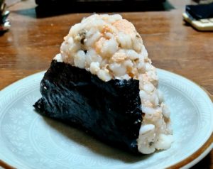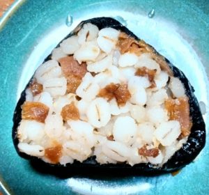 1、もち麦に梅ぼしを混ぜてラップに包み三角形に握る。