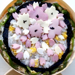 作り方:ゆで卵白身をさくらの型で抜いて着色する。(30分から1時間くらい)。