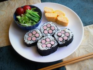 3巻きすに焼のり全形1/2枚を置き、その上にすしめしを海苔の端まで均一に敷き詰める。中央に2で作っておいた花をのせて、手前と向こう側の巻きを持ち、ごはんとごはんをくっつけるように巻いて落ち着かせる。4切れにカットして出来上がり。