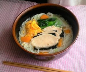 <材料>1そうめん1束・2チキンスープ(自家製サラダチキンの煮汁250cc+水250cc)・3自家製サラダチキン30g・4錦糸卵1/2個分・5人参(半月切り)30g・6小松菜(ゆでて4㎝にカット)40g・7キャベツ(せん切り)中1枚・8焼のり全形1/8切3枚・9柚子こしょう適宜