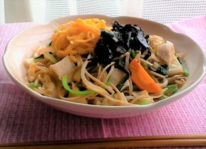<材料>1乾そば45g・2もやし100g・3キャベツ(ざく切り)中1枚・4人参(半月切り)30g・5小松菜(長さ3㎝)60g・6自家製サラダチキン40g・7錦糸卵1/2個分・8かつお節適宜・9焼のり全形1/4枚・調味料(マヨネーズ小さじ1・塩・こしょう)