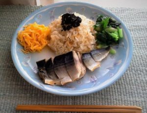 4もやしごはん、塩サバ、錦糸卵、小松菜を盛り付けて出来上がり。サバを粗めにほぐして、錦糸卵、手でちぎった焼のりを混ぜながらいただく。