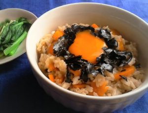 <材料>炊き込みご飯:1米1合・2水・3豚肉(粗めの細切れ)40g・4椎茸(せん切り)1枚・5人参(短冊切り)1/2本・6切昆布適宜・7調味料(めんつゆ大さじ2・酒小さじ1・醤油大さじ1) 卵かけごはん:炊き込みごはん150g・2卵1個・焼のり全形1/4枚