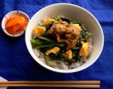 3器にごはんを盛り付け、空芯菜に手でちぎった焼のりをまぶしてのせる、その中央に1の豚肉をのせる。2のいり卵を散らして飾り出来上がり。