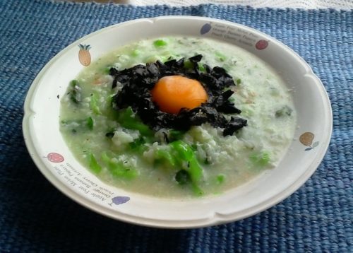 2煮汁が沸騰したら、1で混ぜておいたごはんを加えて煮る。ふわっとしてきたら、七草と野菜を入れる。