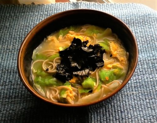 <材料>1乾そば50g・2キャベツ(粗い短冊切り)大葉2枚・3卵1個・4ポタージュの素1袋・5焼のり全形1/2枚・6かつお粉末適宜