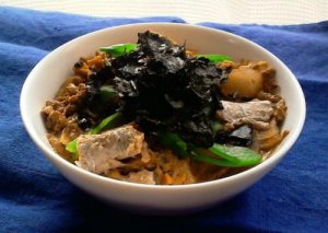 3器にごはんを盛り、その上に2をのせ茹でておいたエンドウと、手で細かくきざんだ焼のりをのせて出来上がり。