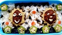 材料:ごはん150g、焼のり、肉だんご、カニかま、オクラ、たてがみ・目・鼻・口(薄焼き卵・スライ