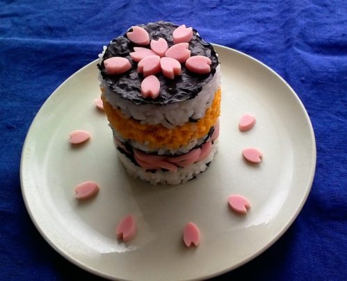 3盛り付用のお皿に海苔をしき、その上にセルクルをのせて、1/3量のすし飯を詰め海苔をのせる、その上にソーセージをのせる。さらにちぎっておいた海苔をのせて1/3量のすし飯を詰めて、海苔をのせて炒り卵を詰める。