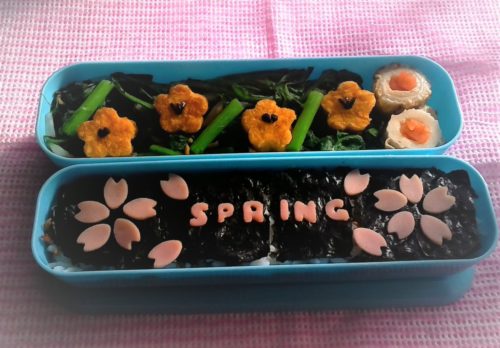 1のり弁:ごはんにちりめんを混ぜて容器に詰めて海苔をのせる。ハムは英字と桜の花びらの型で抜いて海苔の上に並べる。