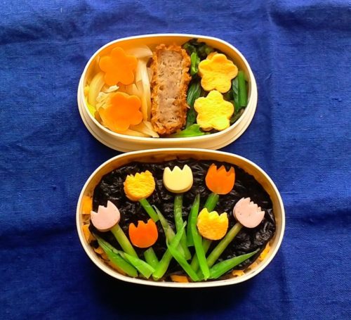 1チューリップ:黄:卵に砂糖小さじ1弱、塩少々を加えて、薄焼卵を作り、チューリップ型で抜く。白:スライスチーズ・赤;人参・ピンク:魚肉ソーセージをチューリップ型で抜く。茎・葉:小松菜の茎をレンジ加熱する。茎部は長さにあわせて切って、葉部は斜めにカットする。
