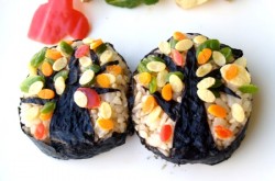 1 栗ごはんで、おにぎりを2つ作る。2 おにぎりに周りに焼のりを巻く。3 焼のりで木の幹と枝を作り、おにぎりに貼る。4 市販の型で葉っぱになる各野菜を抜いて彩を考えながらおにぎりにのせる。
