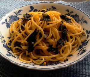 <材料>1スパゲティ60g・2卵1個・3ナチュラルチーズ40g・4玉ねぎ(くし切り)小1個・5焼のり全形2枚・6お茶漬けの素鮭1袋・7黒コショウ適宜