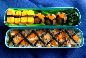 1、米2合と白ごはん2合を炊く時の水加減をして、炊き込みごはんの素と3mm幅の細切りにした人参を加えて炊き、蒸らしてお弁当箱に詰める。