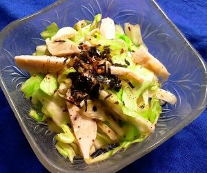 1、キャベツは幅2㎝位の短冊切りにして、ポリ袋に入れる。お茶漬けの素1袋を全部加えて軽くもむ。