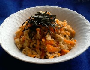 <材料>1おから100g・2人参(せん切り)50g・3卵1個・4お茶漬けの素1袋・5水50~75cc・6きざみのり適宜