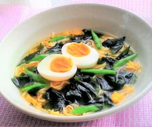 <材料>1生ラーメン1玉・2ゆで卵1個・3さやいんげん(ゆでて斜め切り)4本・4海藻スープ5g・5チューブにんにく適宜・6チューブしょうが適宜・7水350cc