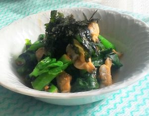 3、合わせた調味料1に、2のつるむらさきを加えて混ぜ、韓国もみのりを加えさっくりと混ぜ、器に盛りつけてうえる。最後に韓国もみのりをたっぷりとかけて出来上がり。