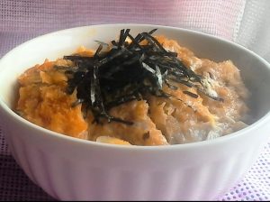 4、器にごはんを入れ、その上に加熱した3のカツをのせて、きざみのりをかけて出来上がり。