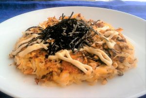 4、焼き上がったら、お皿にとって、マヨネーズ、お好みでケチャップや醤油を適量かけて、かつお節ときざみ海苔をたっぷりのせて出来上がり。