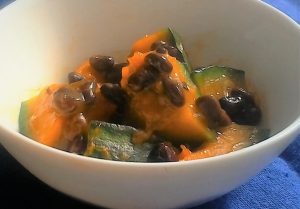 <材料>1かぼちゃ(一口大)140g・2赤飯の素30g・3砂糖大さじ1杯・4めんつゆ小さじ1杯・5片栗粉3g
