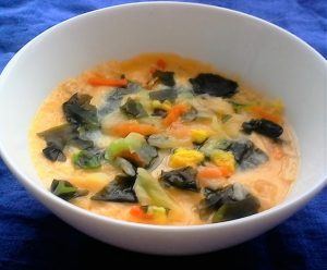 <材料>1卵1個・2彩り野菜とわかめのスープ5g・3自家製鶏ハム40g