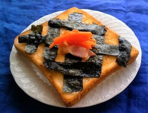 2、味のりを1cm幅に切って、格子状にトーストにのせる。