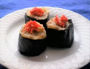 2、温まったシュウマイに海苔を巻いて紅しょうがをのせて出来上がり。