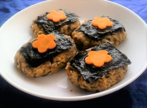<材料>1サバ缶(固形分のみ)1缶・2木綿豆腐100g・3玉ねぎ(みじん切り)30g・4梅昆布茶漬けの素1袋・5片栗粉大さじ2杯・6焼のり全形3切2枚・7砂糖小さじ1杯