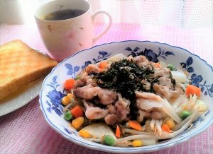 <材料>1豚肉こま切75g・2もやし70g・3玉ねぎ(くし切)70g・4冷凍ミックスベジタブル70g・5片栗粉適量・6焼のりとろろ昆布2g・7調味料(めんつゆ大さじ1杯・酢小さじ1杯)