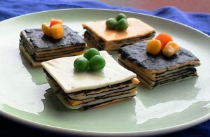 <材料>1スライスチーズ6枚90g(プレーン・チェダー各3枚)2ミックスベジタブル少々・3オリーブオイル味海苔全形1枚(全形10切10枚)