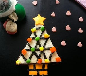 5、幹は、1で切り取ったパンを組み合わせて、スライスチーズをのせ、焼のりでレンガ模様にする、星形に抜いたチーズをツリーの頂上にかざって出来上がり。¥