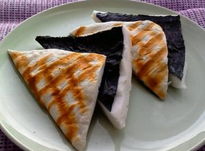 2、波状のフライペンを熱し、はんぺんをのせて格子状に焼き。三角形に切って出来上がり。