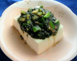 3、器に豆腐をのせて、2のモロヘイヤをかけて出来上がり。