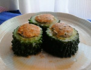 <材料>1ゴーヤ(厚さ3cm)3個・2鶏ひき肉100g・3片栗粉少々・4砂糖小さじ1杯・5お茶漬けの素Ⅰ袋・6オリーブ油少々