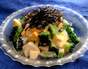 2、ゆで卵は1cm位の粗切りにして、1のゴーヤに加え、マヨネーズ・ヨーグルト・醤油を加えてさっくり混ぜる。