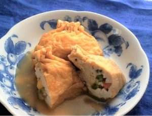 2、鍋に水100㏄と醤油・砂糖・だしの素を加えて1のきんちゃく2個を入れて火にかける、中火で10分位加熱し、火を止めて冷まし味を浸み込ませる。