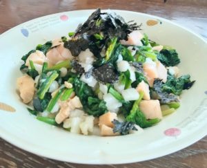 《材料》1ささみハム(角切り)1本-2ほうれん草70g-3押し麦ライス60g-4マヨネーズ小さじ2杯-5豆乳ヨーグルト大さじ1はい-6酢小さじ1杯7こしょう少々-8塩少々-9焼のり全形1/2枚