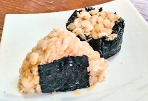 3、握ったものに焼のりを巻いて出来上がり。