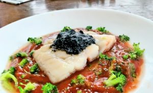 5、器に2のトマトソースを敷きつめ、4の酒蒸したらをのせる。その上に、3の焼のりソースをかけて出来上がり。