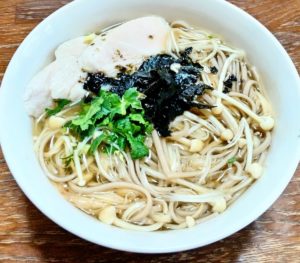 《材料》1乾そば40g-2えのきたけ80g-3大根葉(粗みじん切り)少々-4自家製ささみハム(斜め切り)1/2本-5めんつゆ適量-6焼のり全形1/4枚