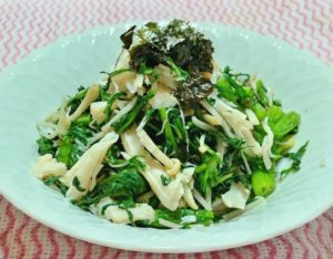 《材料》1えのきたけ(細く割く)60g-2春菊(長さ3cm)60g-3ささみハム(荒く割く)1本-4けずり節1g-5ぽん酢適量-6焼のり全形1/2枚