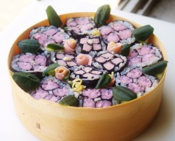 3 1と2のアジサイのり巻きを6~8等分に切って器に詰めて出来上がり。