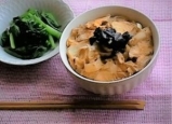 3器にせん切りキャベツを入れ、その上にご飯をのせて、2で仕上げた親子丼の具をのせて、最後に手でちぎった焼のりをかけて出来上がり。 (レンジで加熱した小松菜のおひたしをそえて)