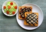 食パンを両面焼き、片面にポモドーロソースと玉ねぎをのせて、チーズ0.5枚分をちぎってのせて、さらに加熱してチーズをとろけさせる。カットした焼のりをのせて出来上がり。